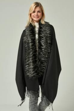 Black-Gray Fur Tasseled Black Poncho NW12110