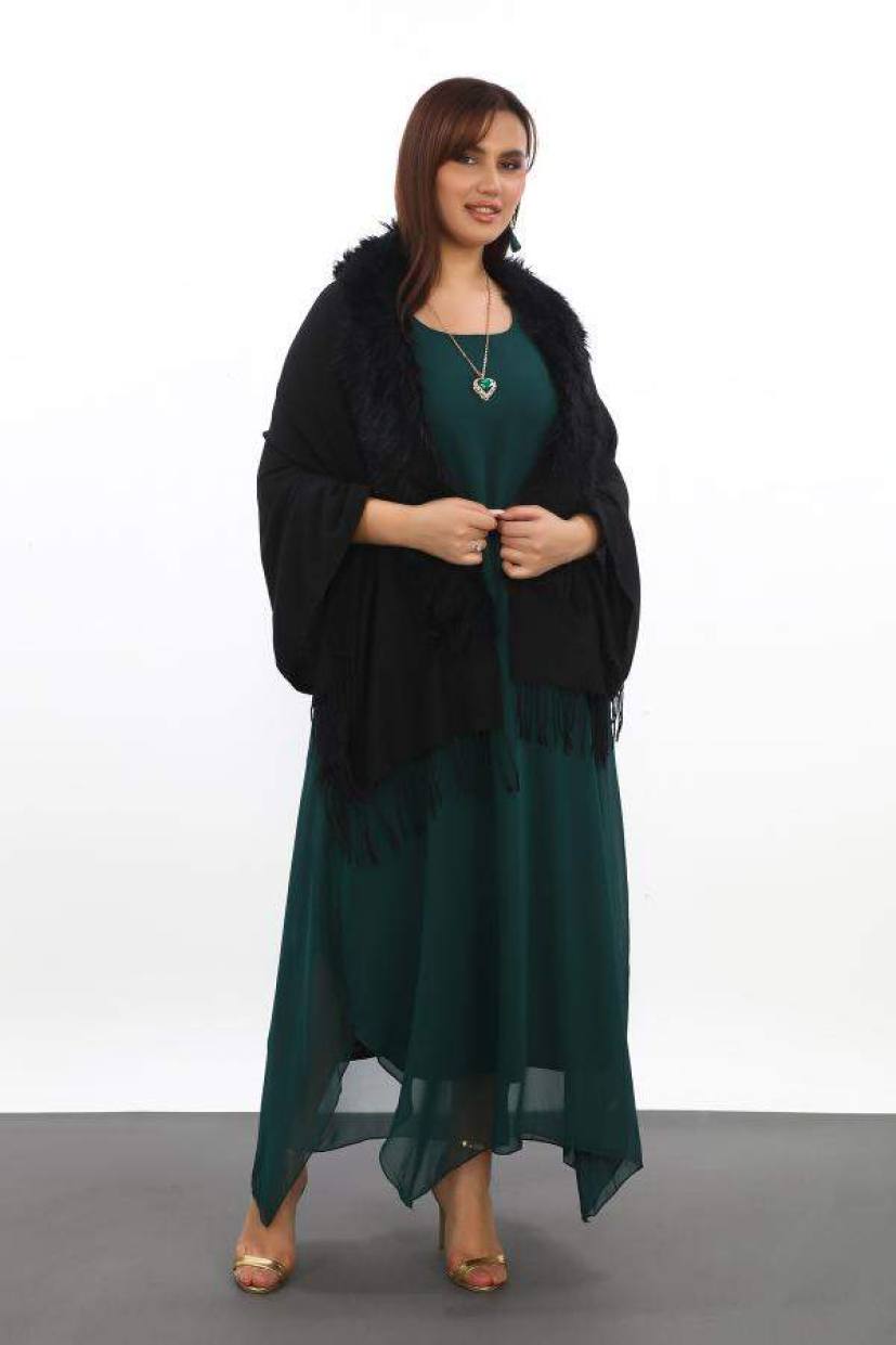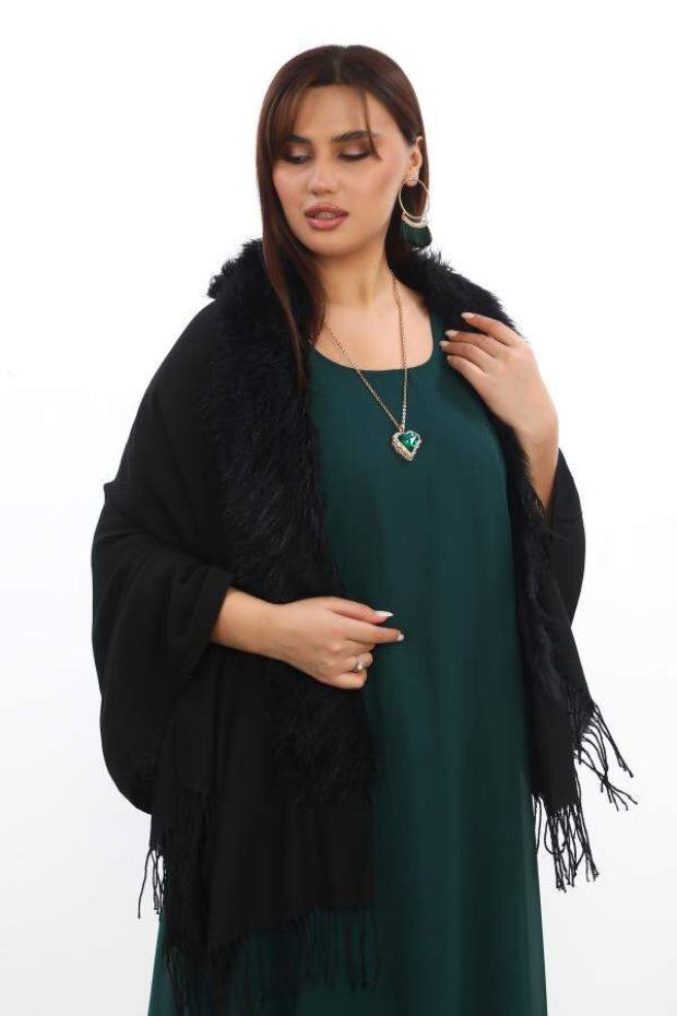 Black-Gray Fur Tasseled Black Poncho NW12110