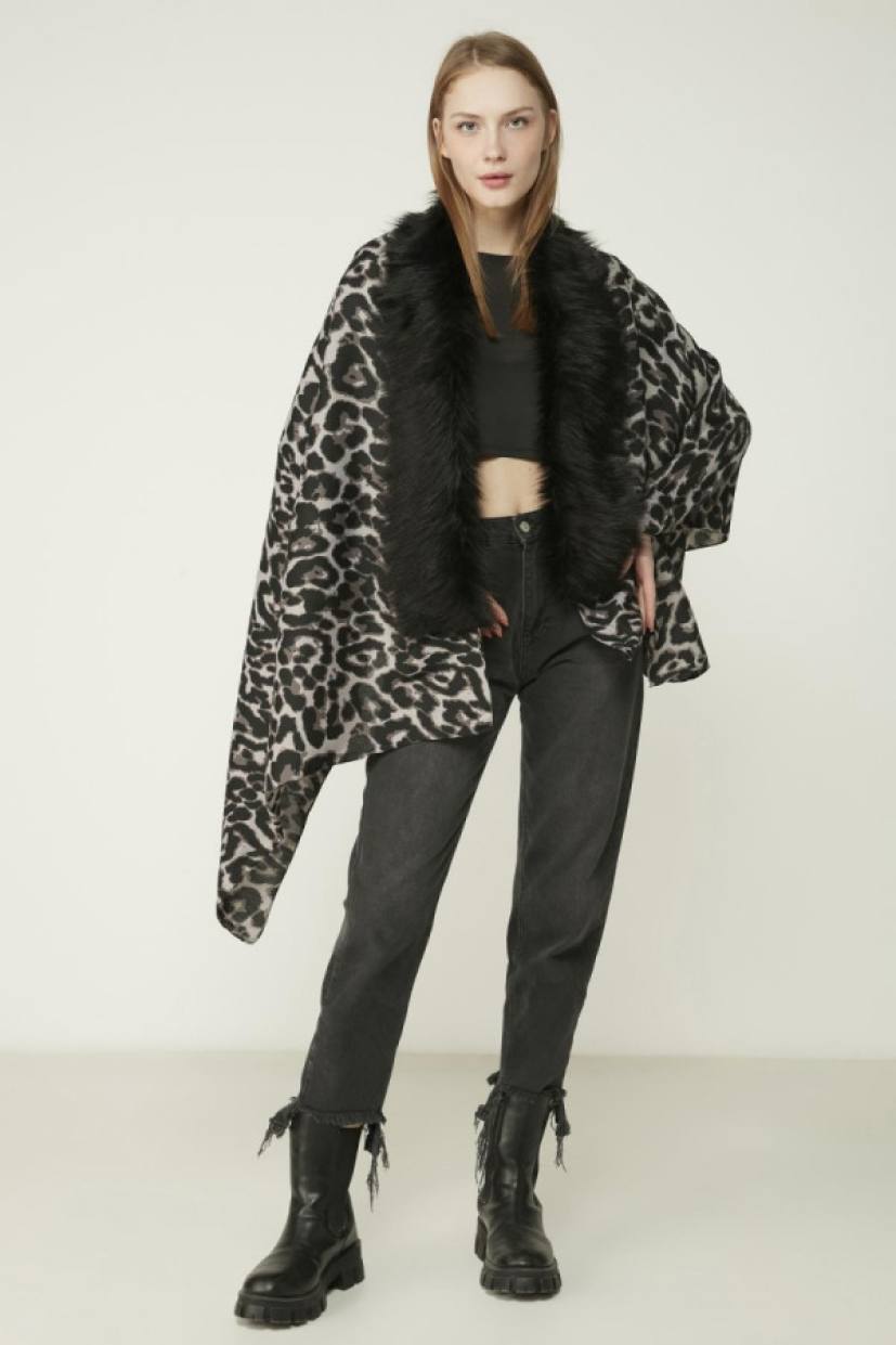 Black-Gray Fur Tasseled Black Poncho NW12110
