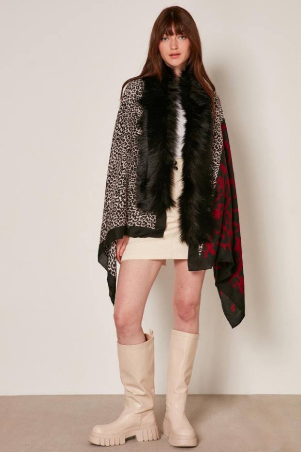 Patchwork Leopard Patterned Burgundy Poncho NW13955-3