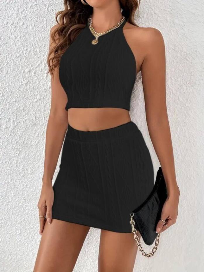 Women's Zero Sleeve Crop Mini Skirt Two Piece Knitwear Set